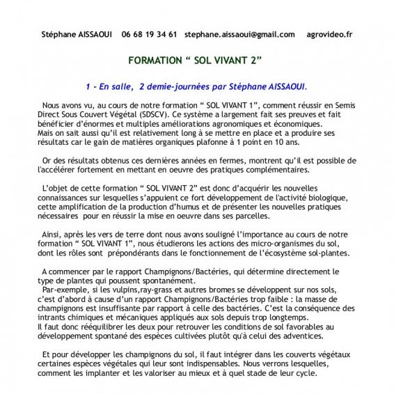 Stéphane Aissaoui,agrovideo et Christophe Piou, ACiste dans le Loir-et-Cher, vous invitent à plusieurs sessions de formations intitulées Sol vivant 1, 2 et 3, et élevage innovant entre novembre 2018 et janvier 2019.