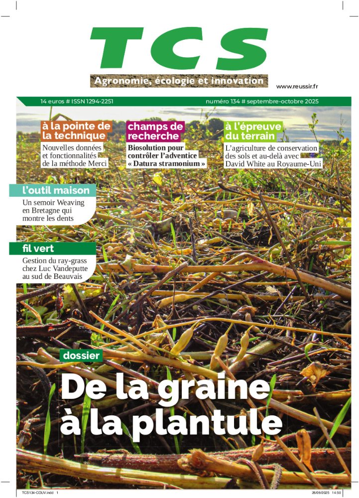 Les semences sont épandues à la volée par des socs équipés d’éclateurs de flux et une herse à l’arrière permet de faciliter le contact sol-graine et de faire un peu de terre fine. Une fissuration est positionnée avant féverole ou prairie si le besoin s’en fait sentir. De manière générale, les prairies de longue durée, l’alternance de cultures différentes, le caractère aléatoire de la rotation et des interventions mécaniques différentes permettent une bonne gestion globale des adventices. Le désherbage mécanique fait également partie de la stratégie dans les cultures de printemps : la herse en pré-levée, la houe entre 1,5 et 2,5 feuilles, puis un à deux passages de herse si nécessaire à une semaine d’intervalle. Une bineuse équipée d’un oeil optique assure la suite en deux passages sur maïs et tournesol ; elle est également utilisée dans le colza et les blés qui sont semés à 24 cm d’écartement.