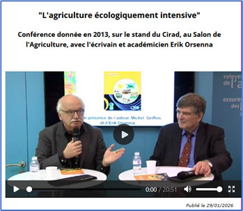 Cette vidéo est riche de plusieurs morceaux de bravoure. Dont une perle, quand Michel Griffon raconte sa rencontre avec Jean-Louis Borloo (minutes 8 à 10), vaillant ministre organisateur du Grenelle de l’environnement, rencontre en forme de joute verbale avec mise au défi de trouver l’expression juste pour la communication gouvernementale : ni révolution doublement verte, ni agriculture à haute valeur environnentale ne convenaient au bouillant ministre, alors Michel Griffon s’étant griffonné les méninges lui proposa : Agriculture écologiquement intensive. Bingo ! Expression pleine et dense, qui eut pour effet de consolider et consacrer dans ses différentes acceptions l’agro-écologie alors encore quelque peu marginale, elle qui de nos jours, se passe aisément de trait d’union, l’union nécessaire entre agriculture et écologie étant généralement admise avec l’adoption, au moins terminologique, de l’agroécologie. Comme quoi, la formulation des concepts, le choix de mots, ont aussi leur importance.