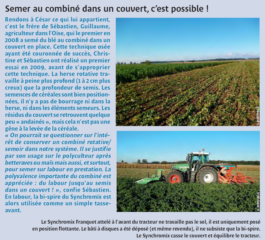 Dans le TCS n°87 de mars/avril/mai 2016, je vous parlais de Christine et Sébastien Rousseau, agriculteurs de la Chapelle-Iger (77) qui, suivant l’exemple du frère de Sébastien, semaient avec succès depuis 2009 des céréales (blé de féverole, blé de blé et orge de printemps) avec un combiné herse rotative/semoir à disques directement dans un couvert en place, sans broyage ni mulchage préalable. La herse rotative travaille à peine plus profond (1 à 2 cm plus creux) que la profondeur de semis. Les semences de céréales sont bien positionnées, il n’y a pas de bourrage ni dans la herse, ni dans les éléments semeurs. Les résidus du couvert se retrouvent quelque peu « andainés », mais cela n’est pas une gêne à la levée de la céréale.