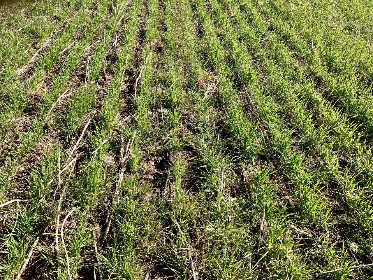 Semis direct de blé (le 13 novembre 2025), sous couvert, en bio : le potentiel est plutôt prometteur, quelques graminées présentes au semis sont déjà bien développées.